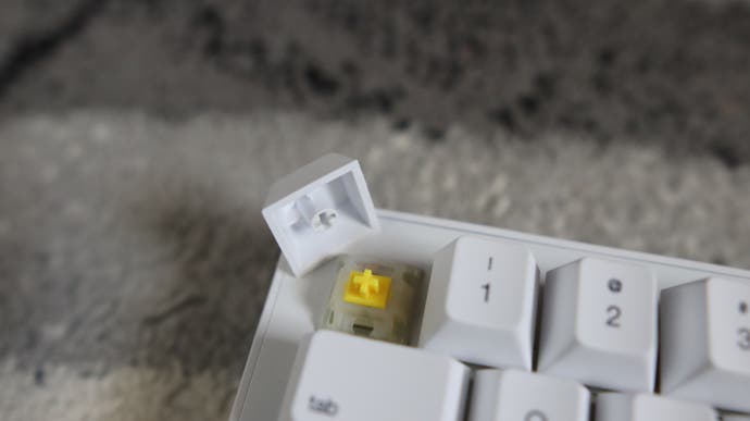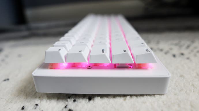 You also get funky aesthetic choices elsewhere on this standard, fully-assembled model with side-printed ABS keycaps. From the top down, they are blank, meaning you've got to be a competent touch-typist at least, although they can at least be swapped out for other keycaps with more standard legend placement if you'd prefer. These are ABS keycaps, so come with a cheaper feel than the PBT I crave, but nonetheless are decent enough under finger.