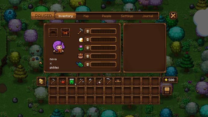Eventually I let my purple-haired hero venture away from customisation and into Cattle Country. This is where the comparisons to Stardew Valley are arguably the strongest, as instead of a farm, you own a ranch that you can build from the ground up with crops, cattle and various enterprises to make sure you've got a place to call home. Your progress is saved at night when you sleep in your bed, but mercifully, there's a fast travel system, so if you don’t feel like walking all the way into town you can teleport there instead thanks to the handy Archibald, who pretty much always seems to hang around on the edge of your farm (which is not at all concerning in the slightest).
