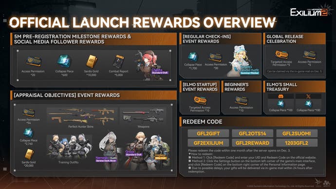 You can get a rundown of all the rewards in the image above, including codes you can redeem and rewards from multiple events. If you want to jump into Girls Frontline 2, you can download it now on PC, iOS, or Android. To stay up to date on the latest info, you can visitthe official websiteor join the community onTwitter,YouTube, orDiscord.