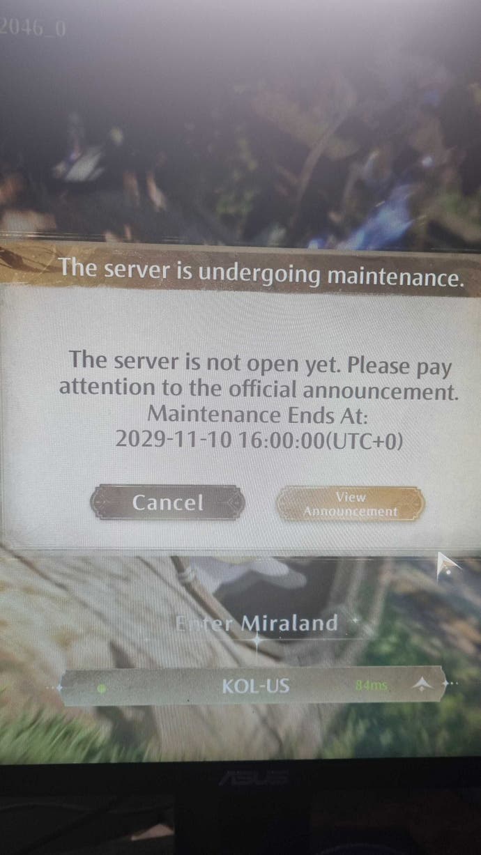 "The server is not open yet," the message on Zoe's screen reads, stating maintenance will conclude in 2029 (which we hope is an error). Additionally, Infinity Nikki's announcement page isn't working for Zoe.