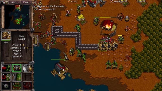 It's not just simple city-building, in other words. Every bit of resource gathering is shot through with clear, strategic intention behind it, and factoring in the defence and protection of your economy is often just as important as making sure you've got enough offensive firepower to overwhelm the opposing force. Destroying entire settlements remains a surprisingly large undertaking in these early Warcraft games, and some missions can last upwards of an hour as you build up your forces and wait for the right time to strike. Blissfully, not every mission boils down to one giant offensive manoeuvre. There's also a decent sprinkling of escort and capture missions in each game's pair of campaigns (humans and orcs, respectively), and sometimes you'll be faced with all of these objectives at once - which the Remasters thankfully keep pinned onscreen below your inventory bar rather than locking them away in a separate, hidden menu.