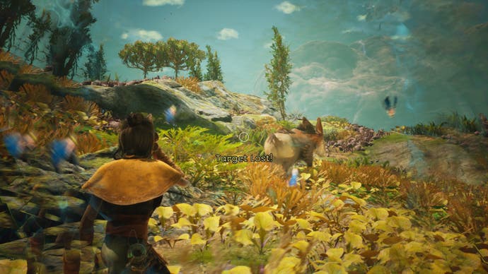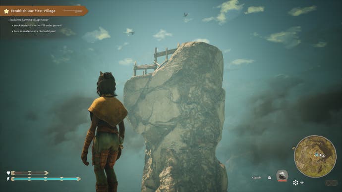 It's scrappy but good natured, I think. The movement is a bit weightless and the camera is a touch too fast to turn. It's cheerfully buggy: at one point I went hunting for fish and was delighted, if confused, to find the fish swimming through the air just above a lake. Rough edges, Early Access. But within a few moments of the opening shipwreck, I was off swimming, gathering supplies and getting myself set up on my new home, too. I gathered sticks and stones and bits of grass to get crafting moving along. I picked an area for that first village and planted that first tree. I met a bunch of elders who sent me down different questlines, all of them handily standing on outcrops of rock looking to the horizon like the wanderer above the sea of fog. They gave me tutorials in rudimentary combat and tools to observe animals to build up a kind of Pokédex. Mostly they set me offdoingthings.