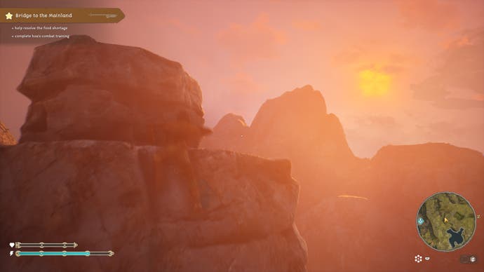 But at some point this morning I got a bit bored of all the doing on offer and just wandered off to see what I could find for myself. And this is where I really started to enjoy the game this small team at Dreamlit is building. The starter island is not particularly big, and a lot of it looks like a burn area from a forest fire. But I found a characterful rock to climb - the climbing and gliding system is straight out of Zelda, with the same kind of stamina meter - and better yet, halfway up I found broken steps chiselled into the surface of the stone. Onwards I went, following steps where there were steps, moving between fragments of ancient things that someone, at some point in the past, had built, until I found a nice little plateau with a decent view and some friendly old ruins. It felt like a personal discovery, just the kind of thing you hope for in a break from busywork.
