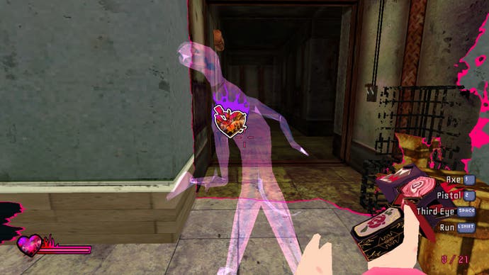 Of course, dimension-hopping and bleeding the real with the unreal is hardly a new idea, but Sorry We're Closed does a great job of stamping its own mark on it, pushing it much further than just the kind of item and obstacle-based puzzles you've come to expect from Resident Evil-style horror throwbacks. You see, it's also integral to the game's first-person combat, as once enemies cross that boundary into your inner circle, their hearts become visible, allowing you to shoot or swing your axe at it for critical damage. Stronger enemies will require more bullets before their heart can be fully broken, while bosses will need you to charge up special one-and-done bullets to take them down properly. The real clincher, though, is that only those heart hits will land when your third eye's open. Anything else will get absorbed into nothing - and bullets will also disintegrate if they, too, pass beyond your eye's outer limits. The closer enemies get to you, particularly when they're coming en masse, the more thrilling and tense fights become - and with increasingly varied enemy types being thrown at you in each of the main dungeons, there's always something new to get your head around.