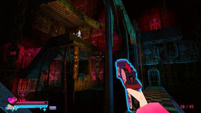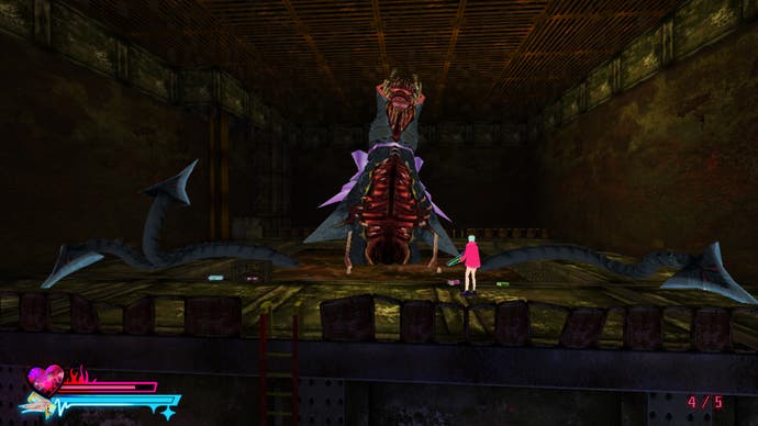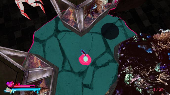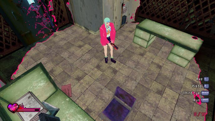 There is, inevitably, a little bit of awkwardness as you transition from third-person exploration to first-person shooting. The camera will naturally remain in whatever direction Michelle's facing when you start to take aim, and she's always rooted to the ground, too, which can make beating a hasty retreat a little frantic in confined spaces. Personally, though, I think it all adds to that sense of dread and unease that seems to permeate its rusty, bloodstained interiors. This is not a game that's had its edges sanded down, and it works - everything from its brash, neon colour palette to its angular, jagged character models makes it clear that this isn't some gooey-eyed play for nostalgia. It would sooner bite your head off than kowtow to that kind of nonsense, and I love that it's retained that sense of friction that makes its players work for the best rewards. Sure, you can close your third eye and just shoot enemies anywhere to your heart's content, but at the cost of precious ammo and (most likely) vital and equally rare life-giving water bottles as the hordes begin to swell.