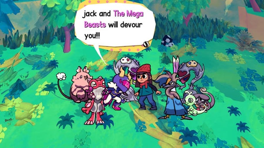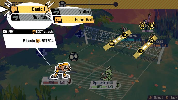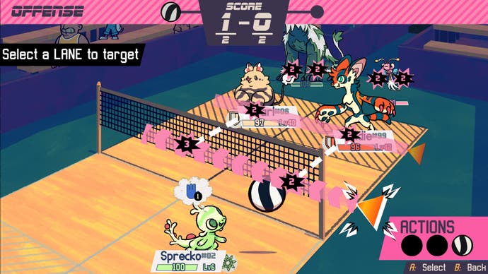 The best bit about Beastieball, though, is the matches themselves, which all take place on volleyball courts that seemingly spring up from the ground as soon as you bump into a wild Beastie. It's kinda daft, but I do also kinda love it. Each side of the net is split into a 2x2 grid, into which you can field two Beasties while the rest of your team hugs the backline, ready to be tagged in whenever they're needed. Teams take turns to attack and defend, the former phase giving you three actions to play out, but just one during the latter. And goodness me, you better make that defensive move count, because if your Beastie gets 'wiped' by the incoming attack, the other team score a point, and if you leave a column or row open and that's where the ball lands? The other team also score. And it's quite possibly the most thrilling tiny tactics game I've played in ages.